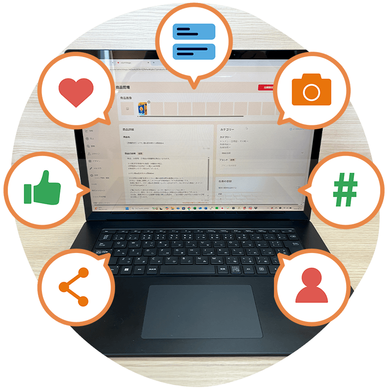 商品画像の作成、編集、出品、価格調査、SNSでの紹介、発信など