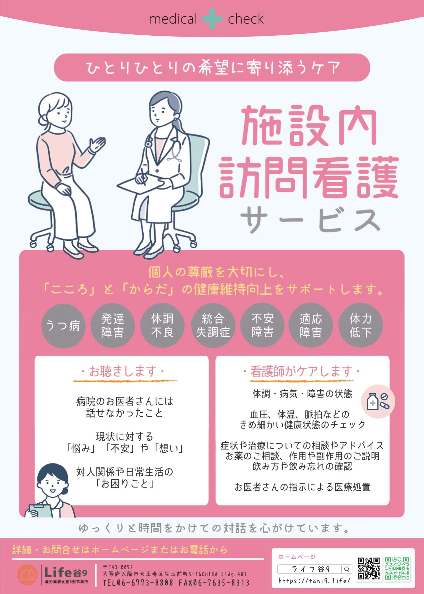 施設内での訪問看護サービスも受けられ、何気ない不安やお悩みにも寄り添える体制があります。
