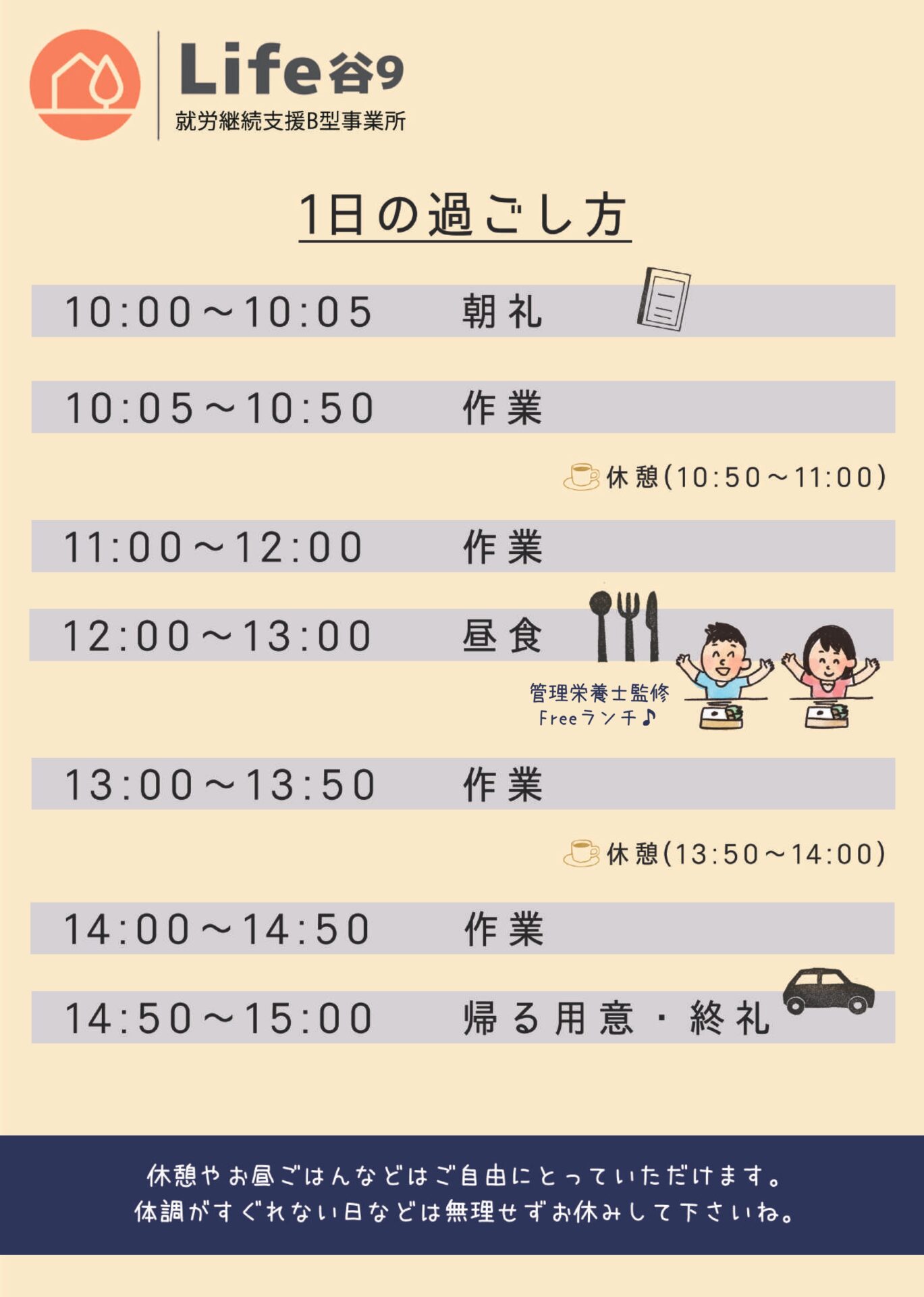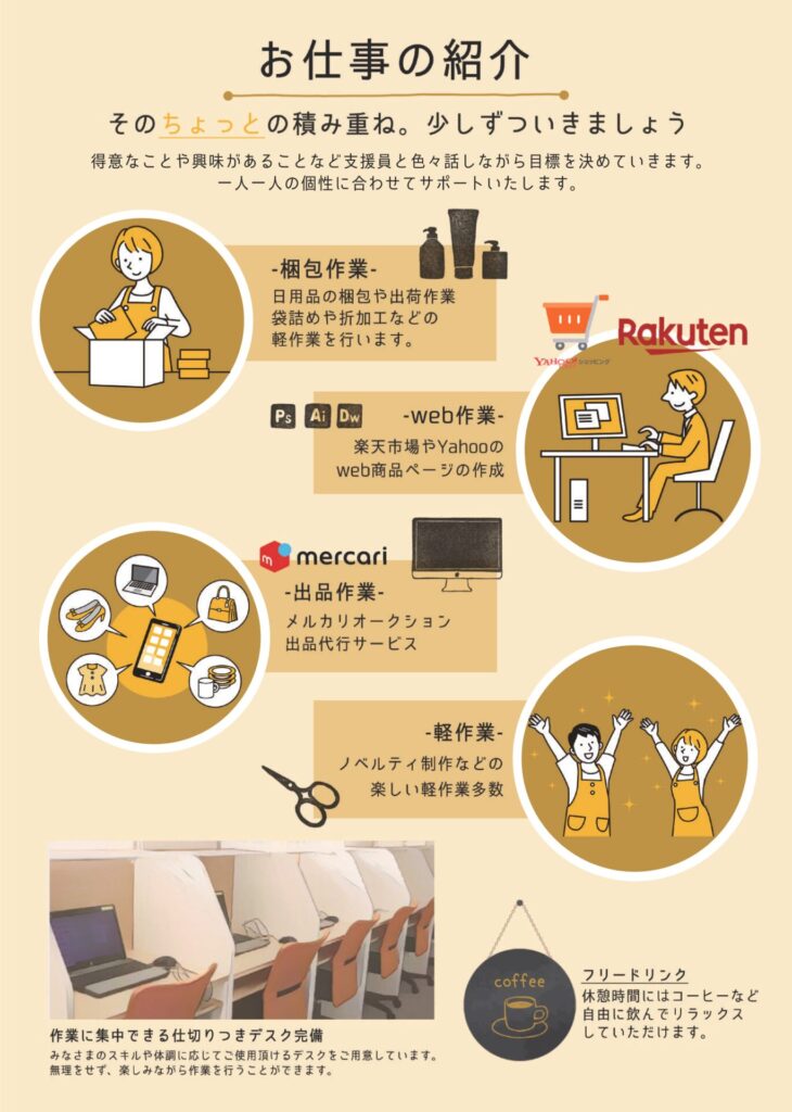 - 在宅支援・施設内支援(通所)・施設外支援(民間企業へ従事)の、3スタイルの支援を提供。